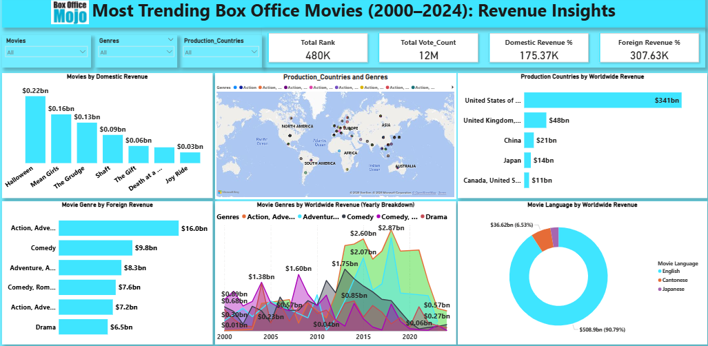 The global movie industry has seen major shifts in audience preferences, international market performance, and genre popularity from 2000 to 2024. However, stakeholders often lack a centralized, data-driven view of how domestic revenue, foreign revenue, production countries, genres, and languages contribute to overall box-office success. This analysis aims to uncover key revenue patterns and provide actionable insights that can guide movie studios, distributors, investors, and streaming platforms toward better strategic decisions.