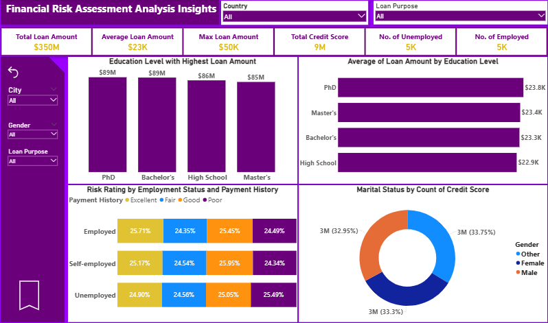 Financial institutions need a clear understanding of how loan risks vary across demographic segments such as employment status, education level, credit scores, and loan purpose. Without proper insights, lenders may approve risky loans, misjudge borrower capability, or overlook opportunities for safer lending. This dashboard helps identify high-risk groups, predict default tendencies, and improve lending decisions.